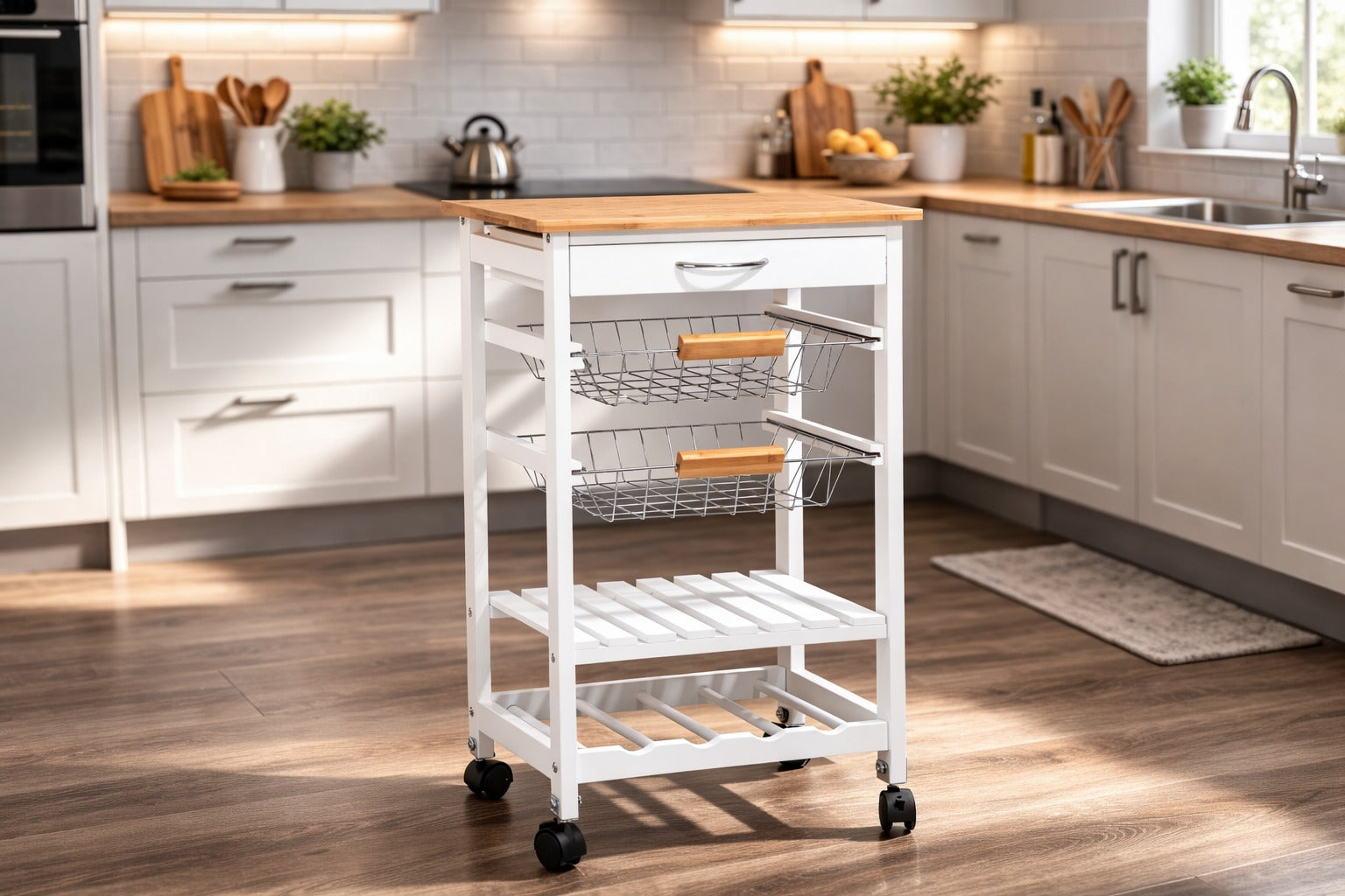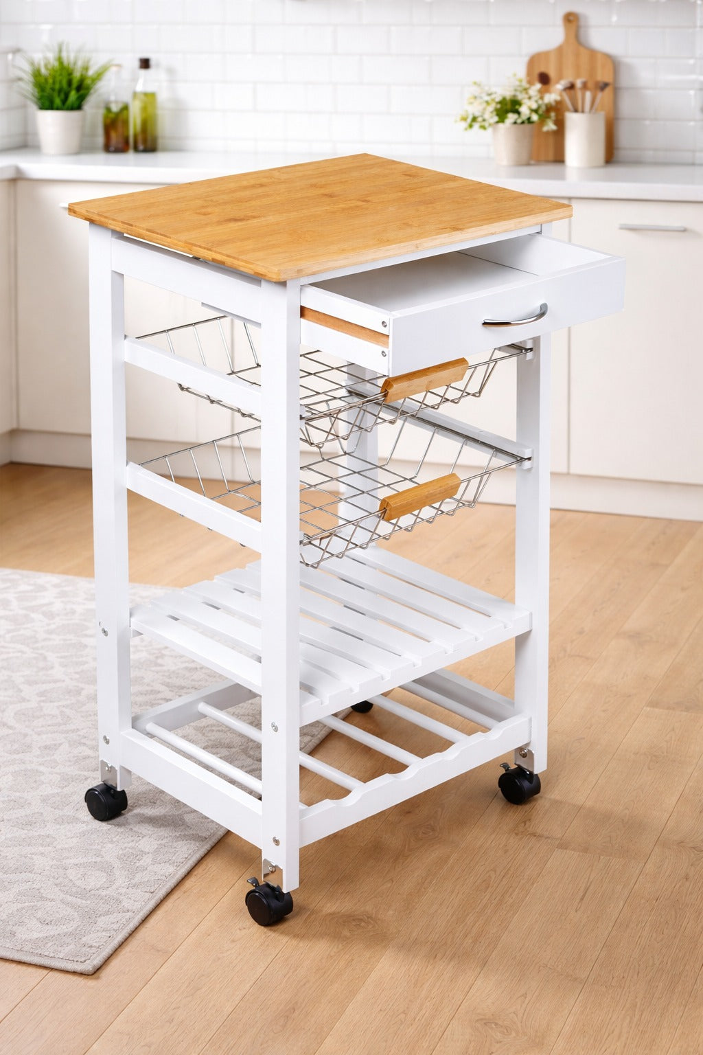 Durable Bamboo Top: The top surface is crafted from eco-friendly bamboo in a warm oak color, offering a sturdy and attractive workspace. Perfect for food preparation, displaying kitchen essentials, or serving dishes, this bamboo top adds a touch of natural elegance to your kitchen.