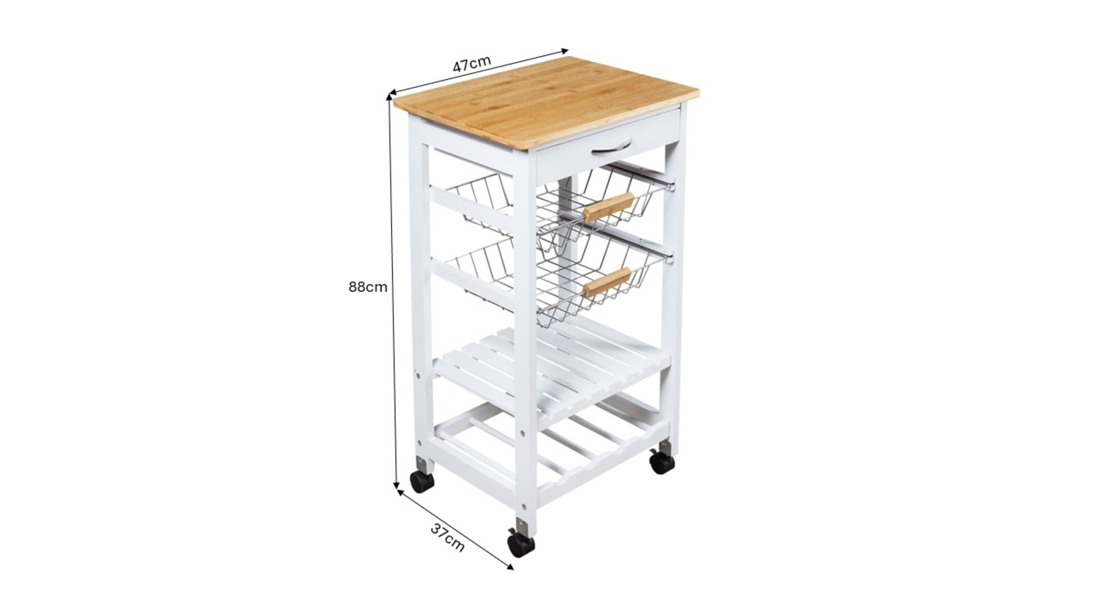 Smooth Mobility with Black Castors: Equipped with black castors, this trolley is fully mobile, allowing you to move it effortlessly around your kitchen or home. The castors feature locking mechanisms, ensuring the trolley stays securely in place when in use.